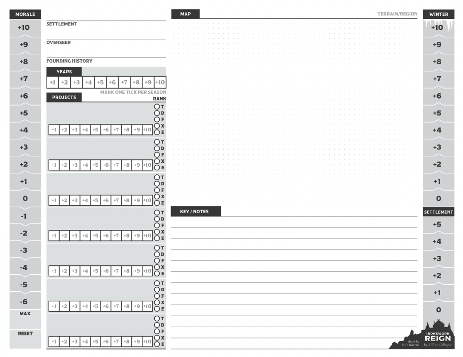 This sheet is designed for Killian Gillespie's Reign, a settlement management expansion to Shawn Tomkin's Ironsworn RPG.