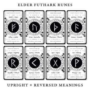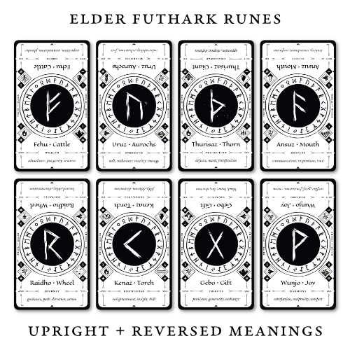 - Rune image, name, literal translation + symbolic meaning, upright or reversed